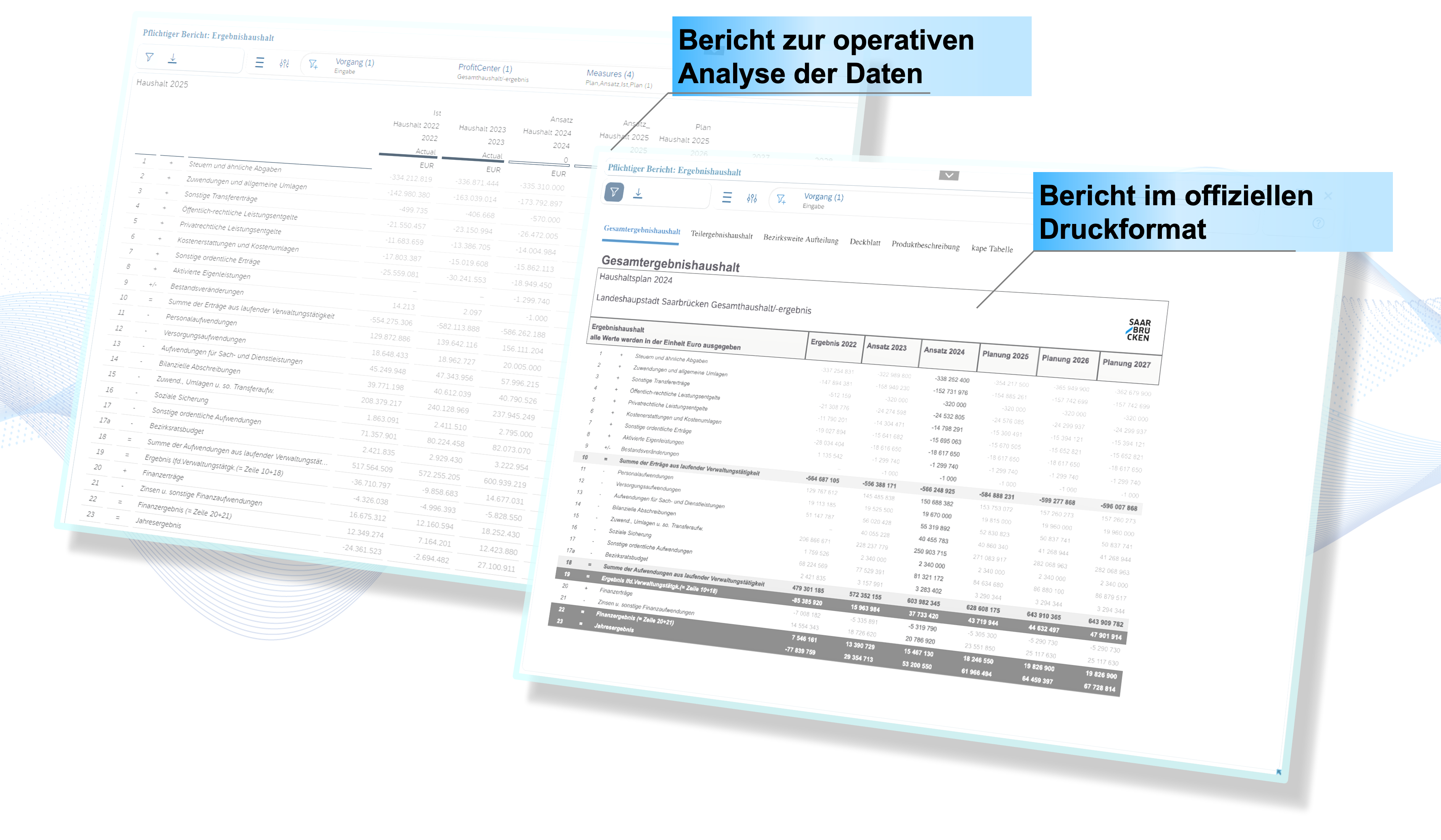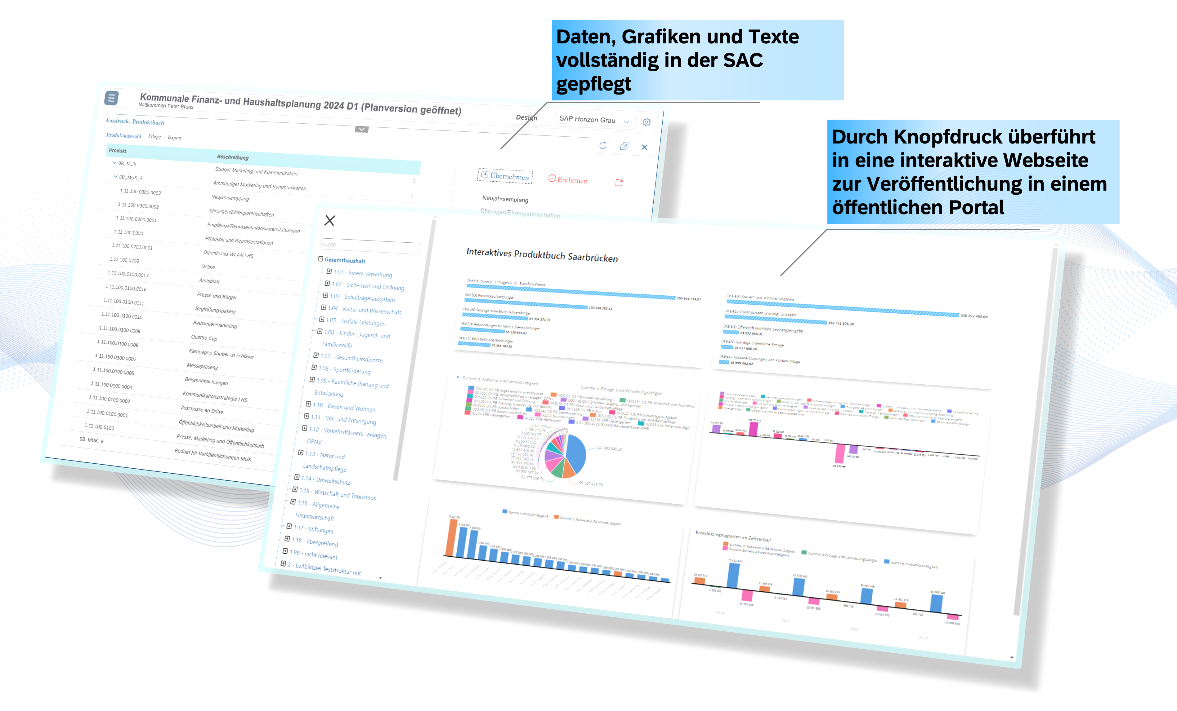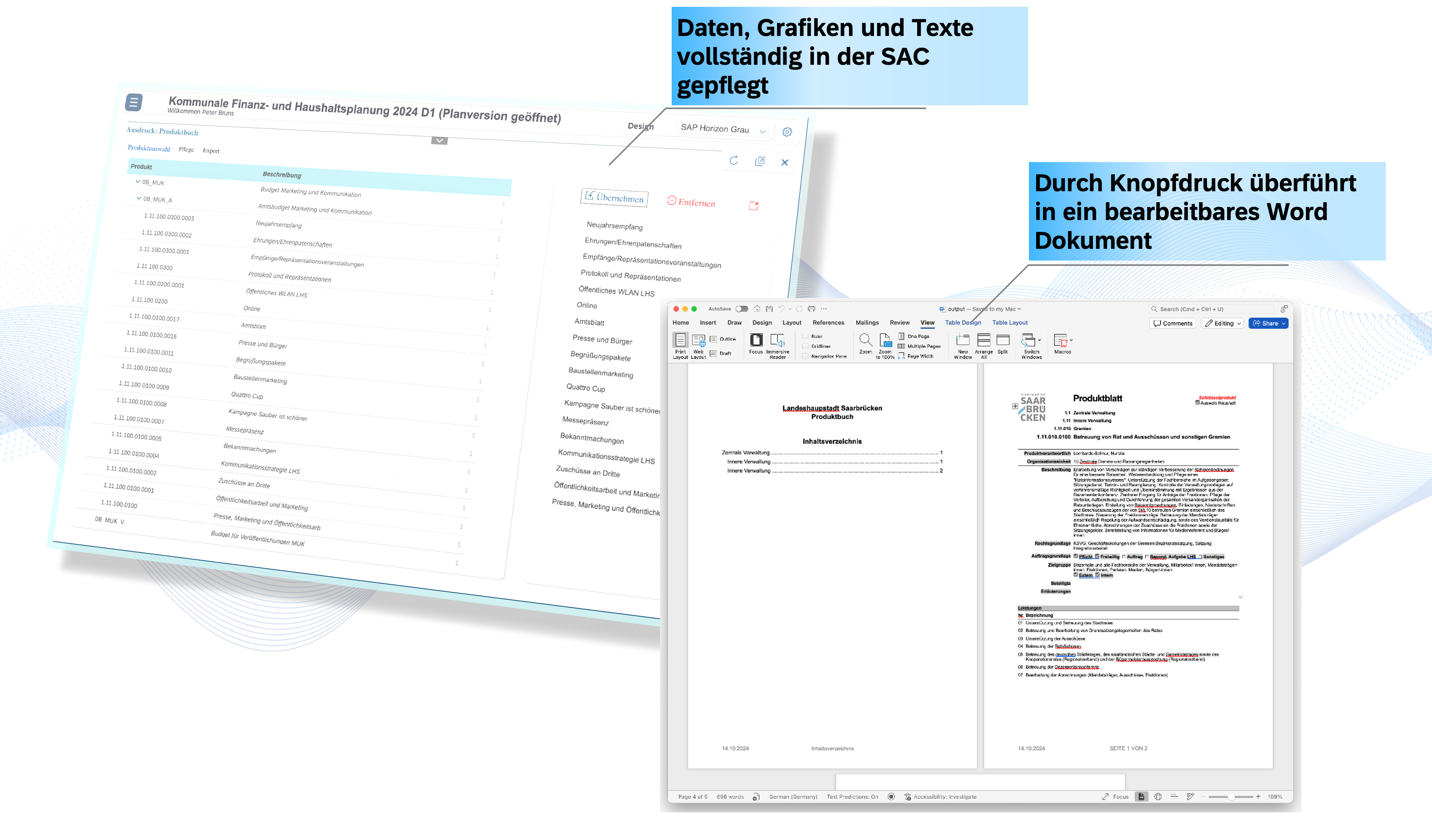Gemäß den gesetzlichen Vorgaben werden Berichte des Haushaltsplans, wie Ergebnishaushalt, Investitionsprogramm und Finanzhaushalt, direkt aus der SAC als formatierte Berichte erstellt. Diese Berichte können dann entweder in Word exportiert oder in eine interaktive Webseite eingebunden werden.